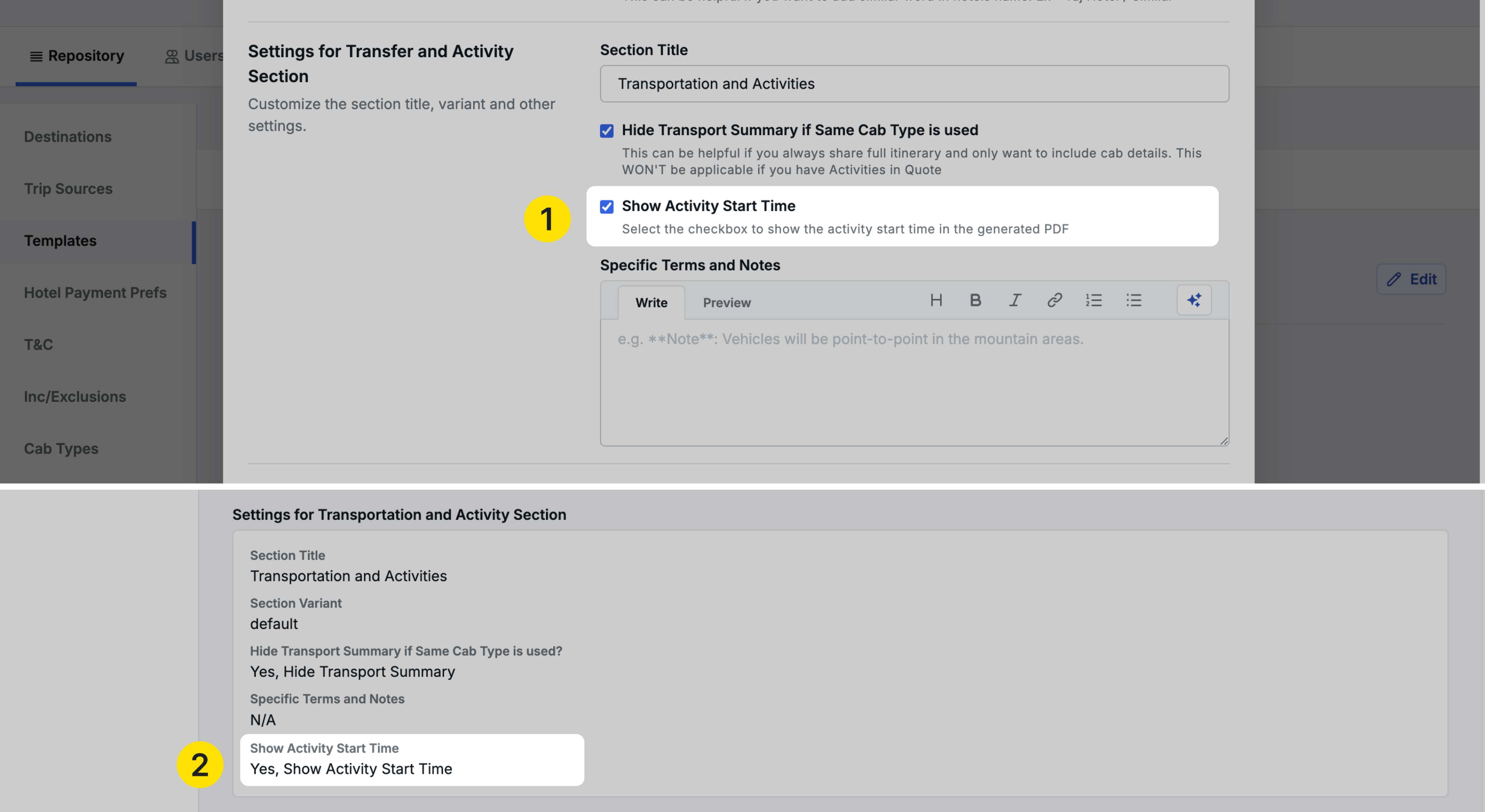 We have added hotel check-in, check-out, and stay details to the Schedule Details popup for transport and activity services.