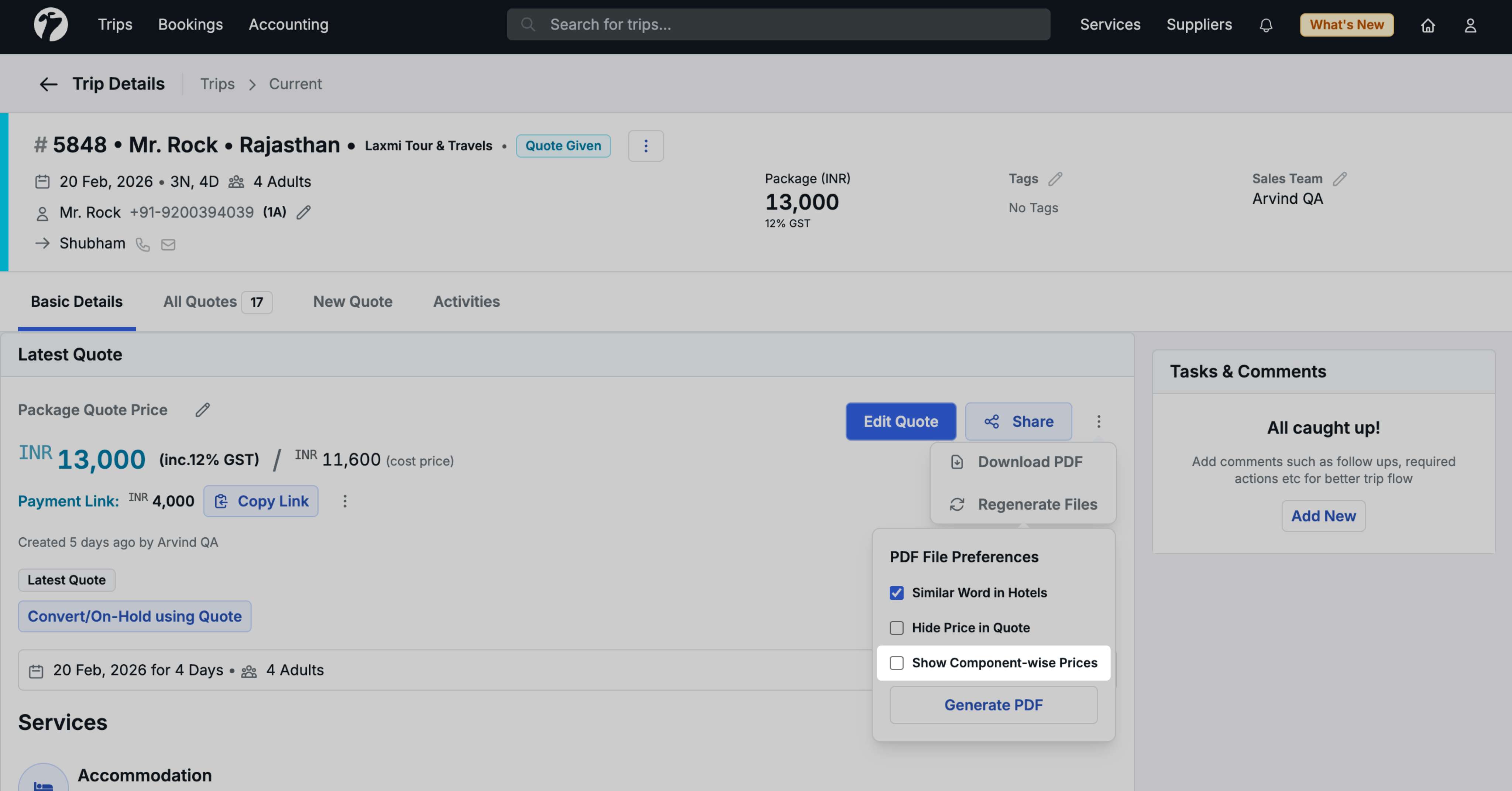 This update introduces a powerful bulk payment clearance system that allows you to log multiple payments in a single transaction, streamlining your payment workflows. We’ve enhanced the Quotation PDF with pricing visibility controls and component-wise totals, added comprehensive report activity tracking for admins, and improved supplier management in operational bookings. Guest salutations are now supported system-wide, and several workflow improvements have been added across payment verification, templates, and reports.