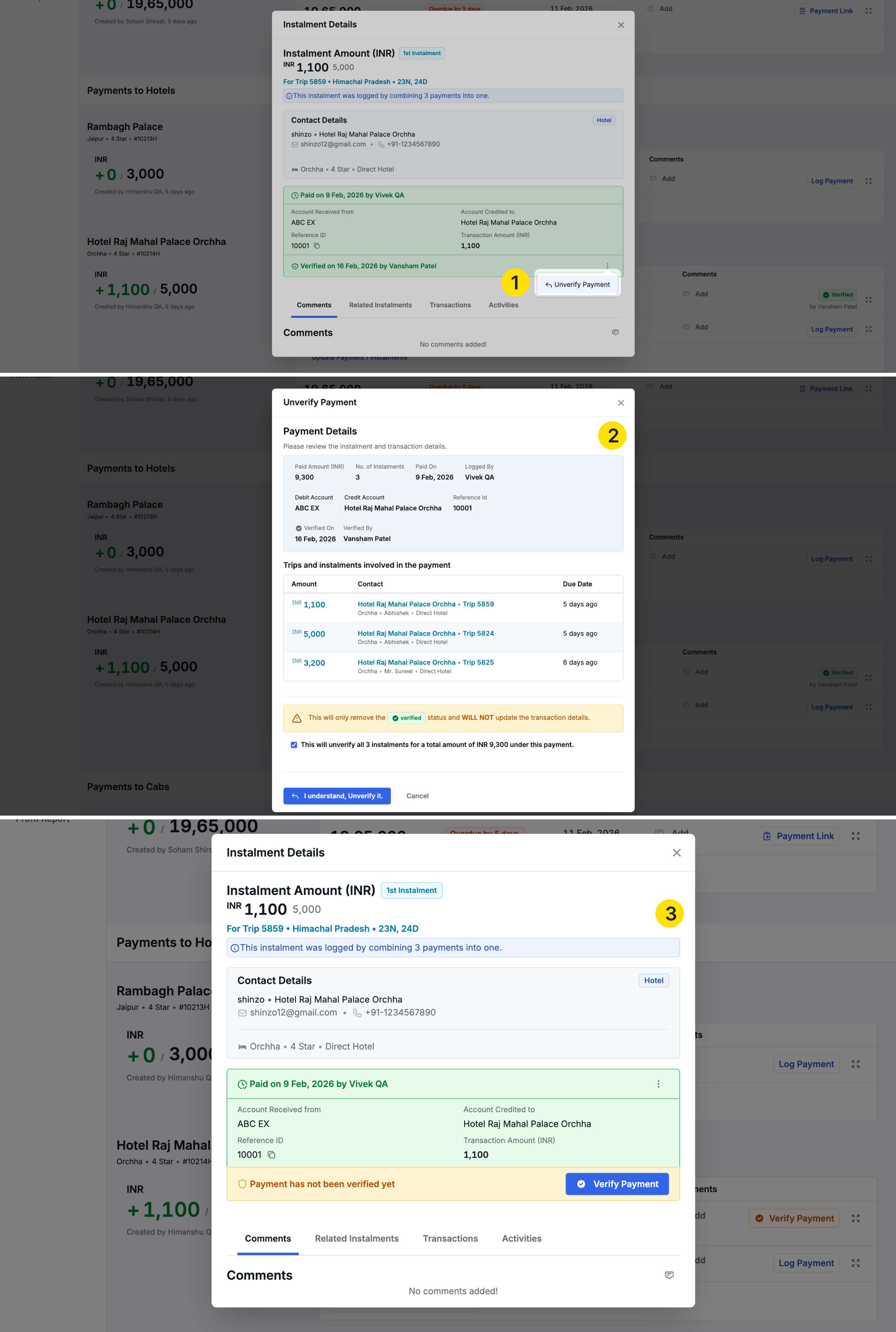 After logging bulk payments, you can verify, unverify, or revert them through the Installment Detail Page.